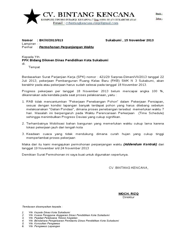 Contoh Surat Addendum Perpanjangan Waktu Pekerjaan Surat P Download Contoh Surat Addendum Perpanjangan Waktu Pekerjaan Surat P Download format surat lain. Demikianlah pembahasan yang dapat kami sampaikan mengenai contoh surat permohonan addendum perpanjangan waktu kontrak kerja. 209921115 Justifikasi Teknis Cco1.