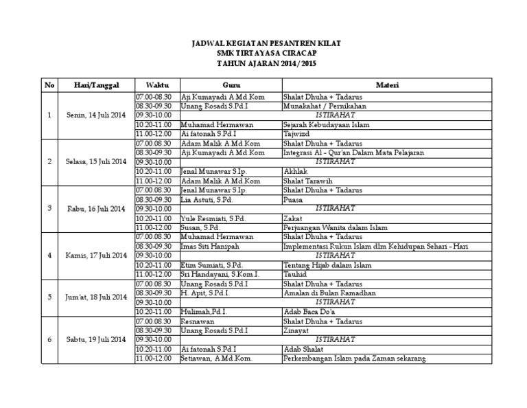 Inilah pembahasan lengkap terkait contoh tabel jadwal kegiatan sehari hari dalam bahasa inggris. Dan juga agenda bulanan santri Rumah Tahfidz Akbar untuk mengisi kekosongan waktu dan menghilangkan kejenuhan ketika menghafal Al-Quran. Admin blog Temukan Contoh 2019 juga mengumpulkan gambar-gambar lainnya terkait contoh tabel jadwal kegiatan sehari hari dalam bahasa inggris dibawah ini.